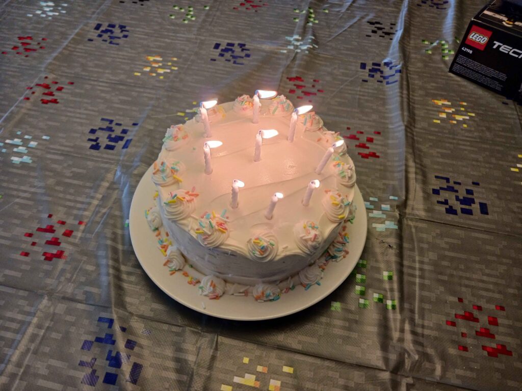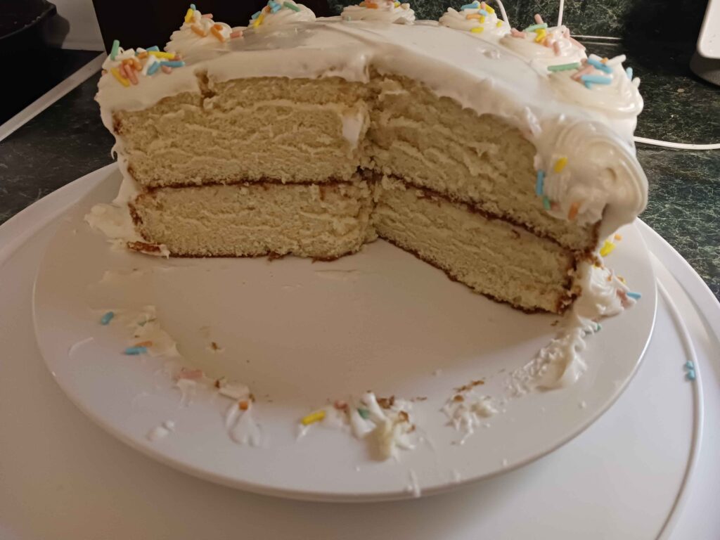 I did not make the frosting. I’ve attempted buttercream (the frosting my kid insisted on) twice and both times did not turn out great. I will try again, but not for his birthday. Instead, I bought 2 tubs of vanilla buttercream with sprinkles – the one color concession my kid gave for this particular cake.